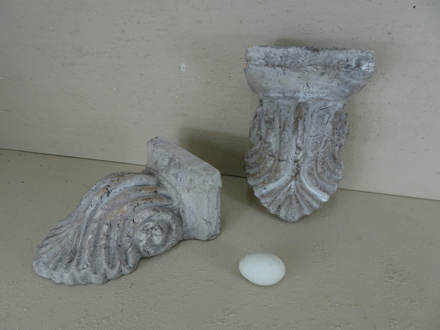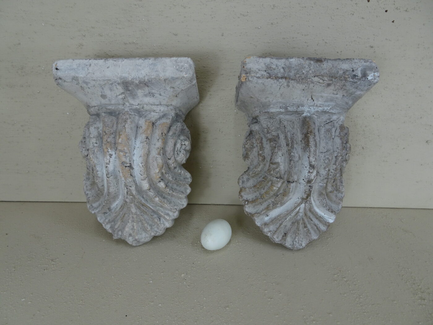 Mid 1900s, made of plaster and painted to match stone. Screw holes and slots to backs enable wall fixing if required as pedestal plinths/corbels.