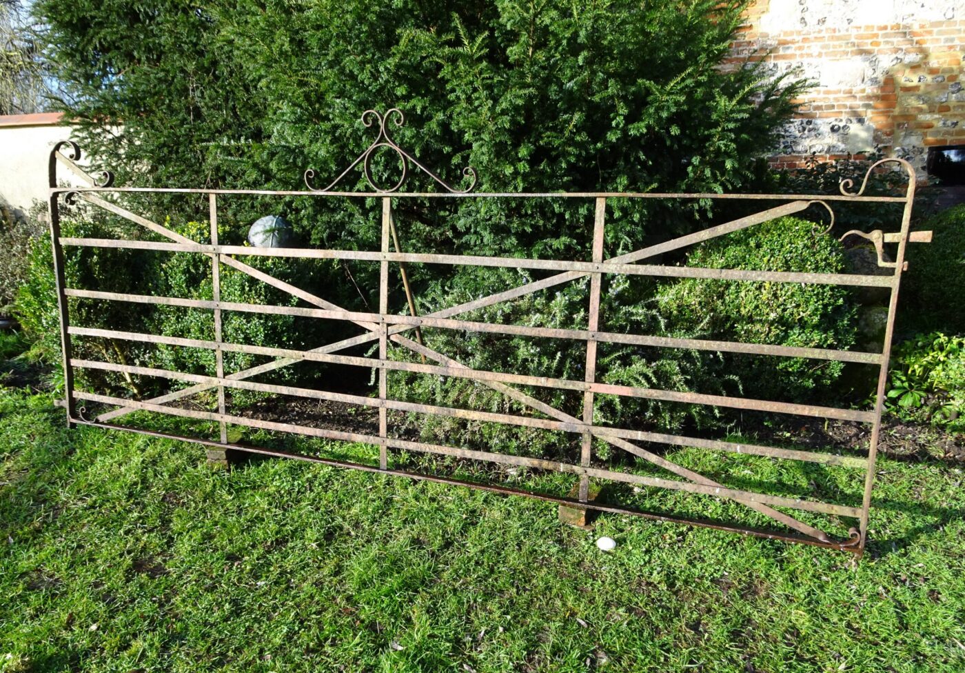 Magnificent, robust and superbly crafted by blacksmith's hand, anvil and hammer around 1900 beside the River Dee valley. Extremely sound and solid throughout and retaining traces of red oxide protective finish. At exceptional length for its time for its time (12 ft plus 2" hinge) this gate is perfectly suited for today's vehicle widths - making it that rare beast - old but perfectly modern.
