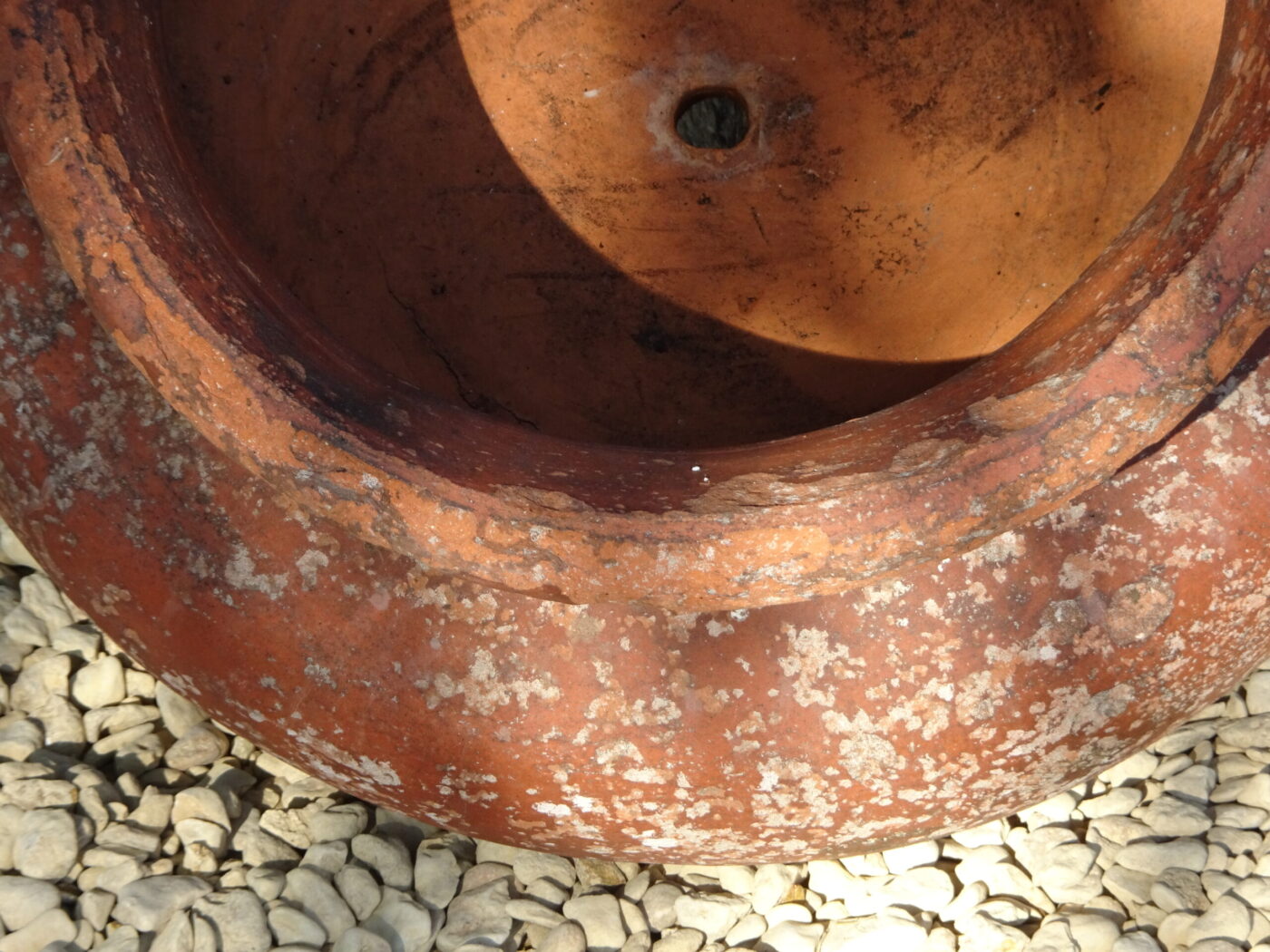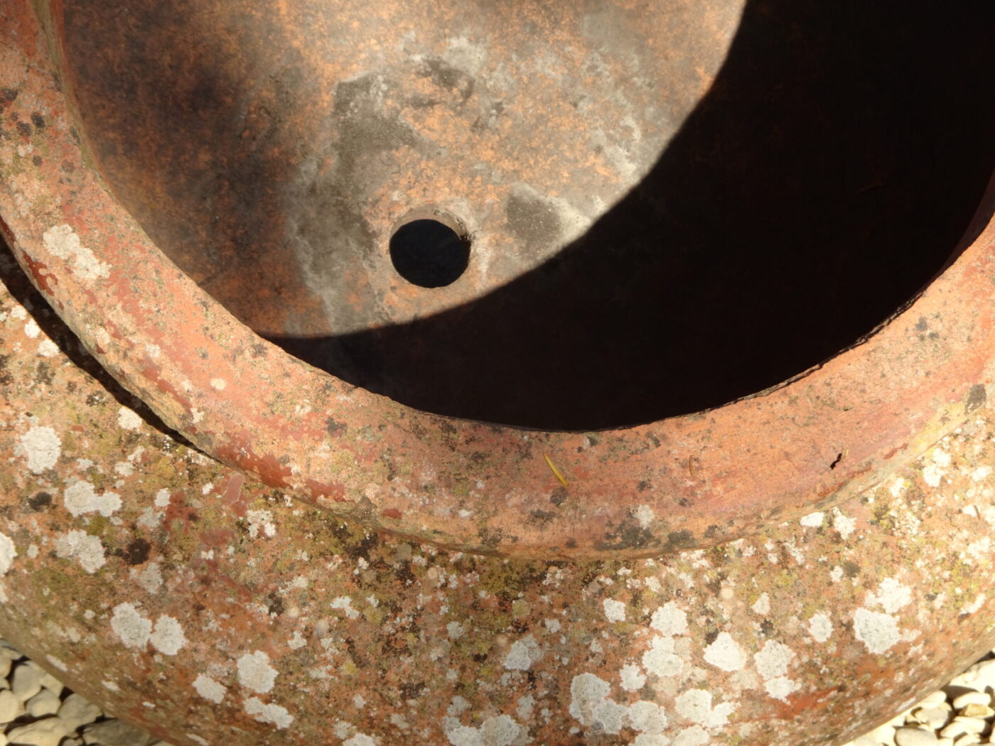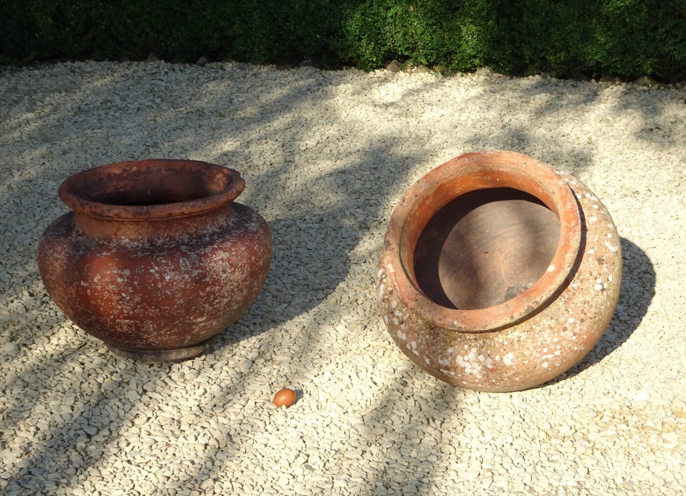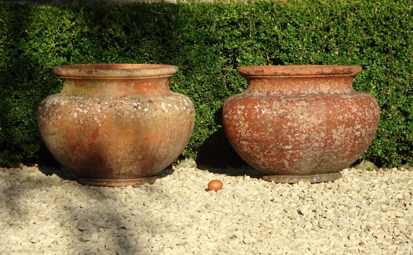 Hand made, of excellent quality and very substantially built. The horizontal ridges of the potter's coaxing fingers are clear inside the pots, the outer glazed surfaces have weathered beautifully with immense charm and character. They make an especially stunning focal point paired either side of a walkway, path or gate.