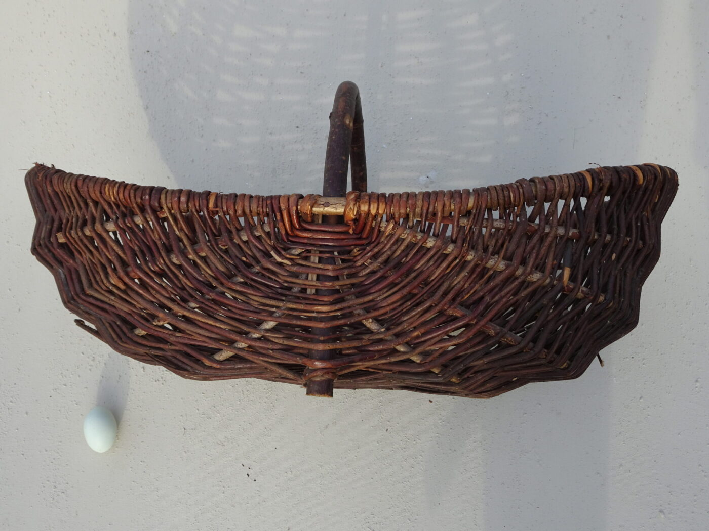 Harvest basket of dark hazel fronds woven around a frame of hazel rim and arch with split hazel ribs - the traditional method for achieving exceptional rigidity.