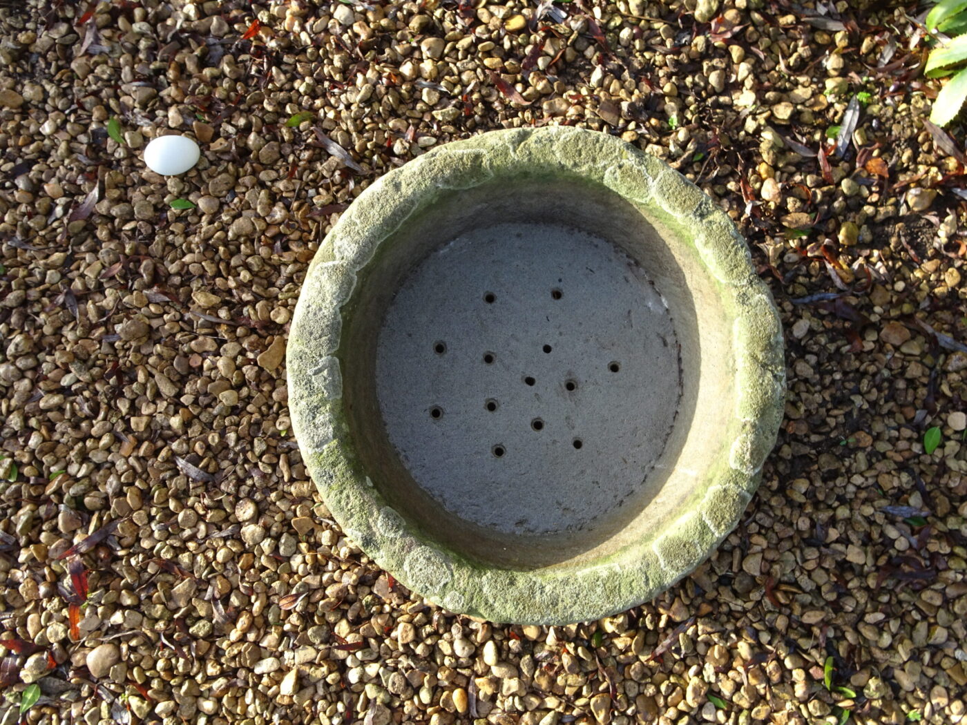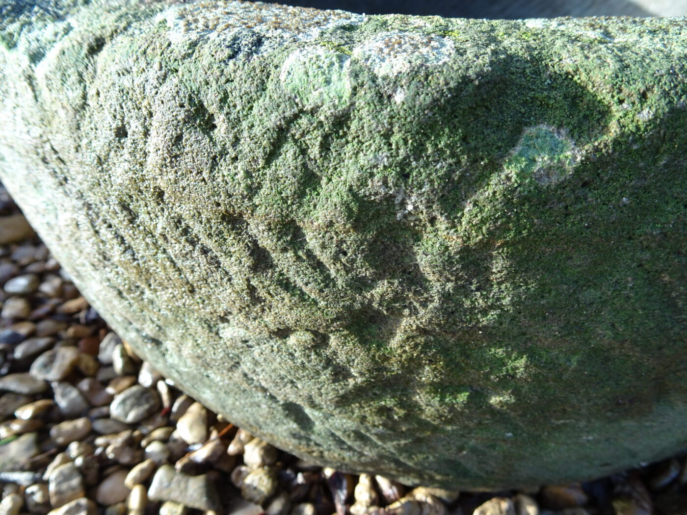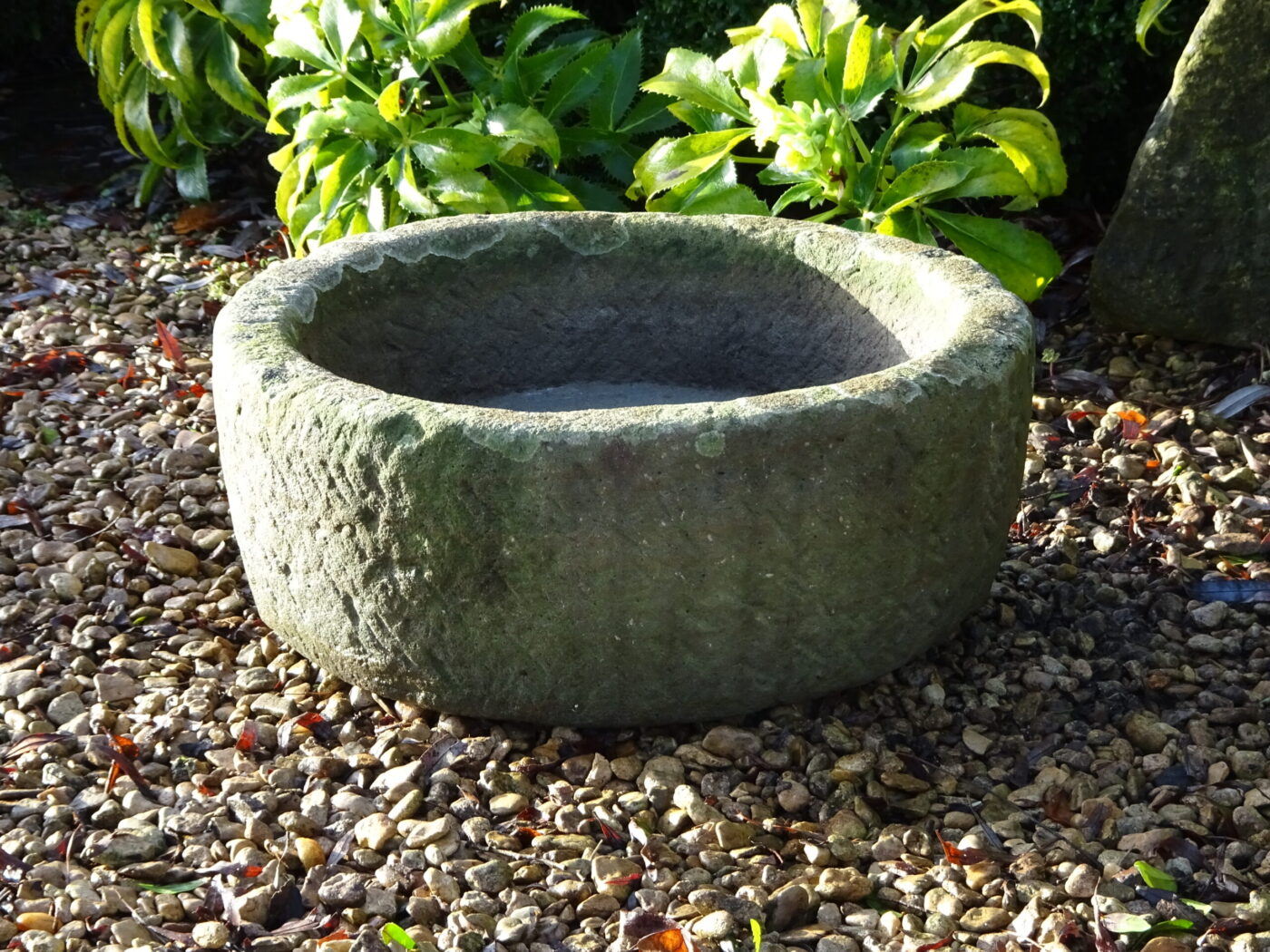 Circular hand carved stone vessel with age-old chisel markings and long-established lichen patina. Originally a rural feed trough or drinking bowl. Excellent condition and at some point diligently drilled for use as a planter. Close grained grey sandstone has proved highly durable.